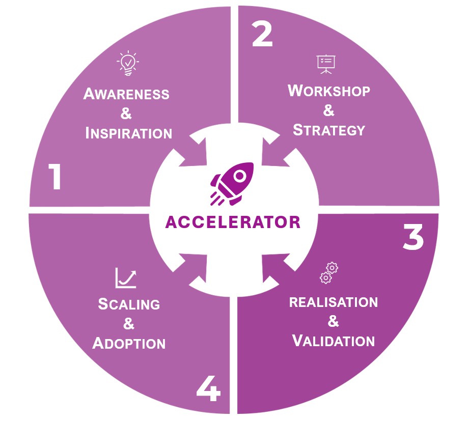 Of je nu oriënteert of al volop bezig bent: jij bepaalt waar we instappen. Wij helpen organisaties zoals die van jou om echt stappen te zetten – van bewustwording tot pilot, en van strategie tot opschaling. Ongeacht welke fase jij je bevindt, het is onze ambitie om jou te helpen versnellen!